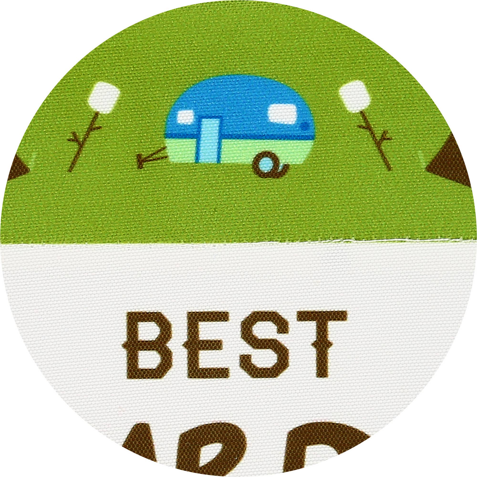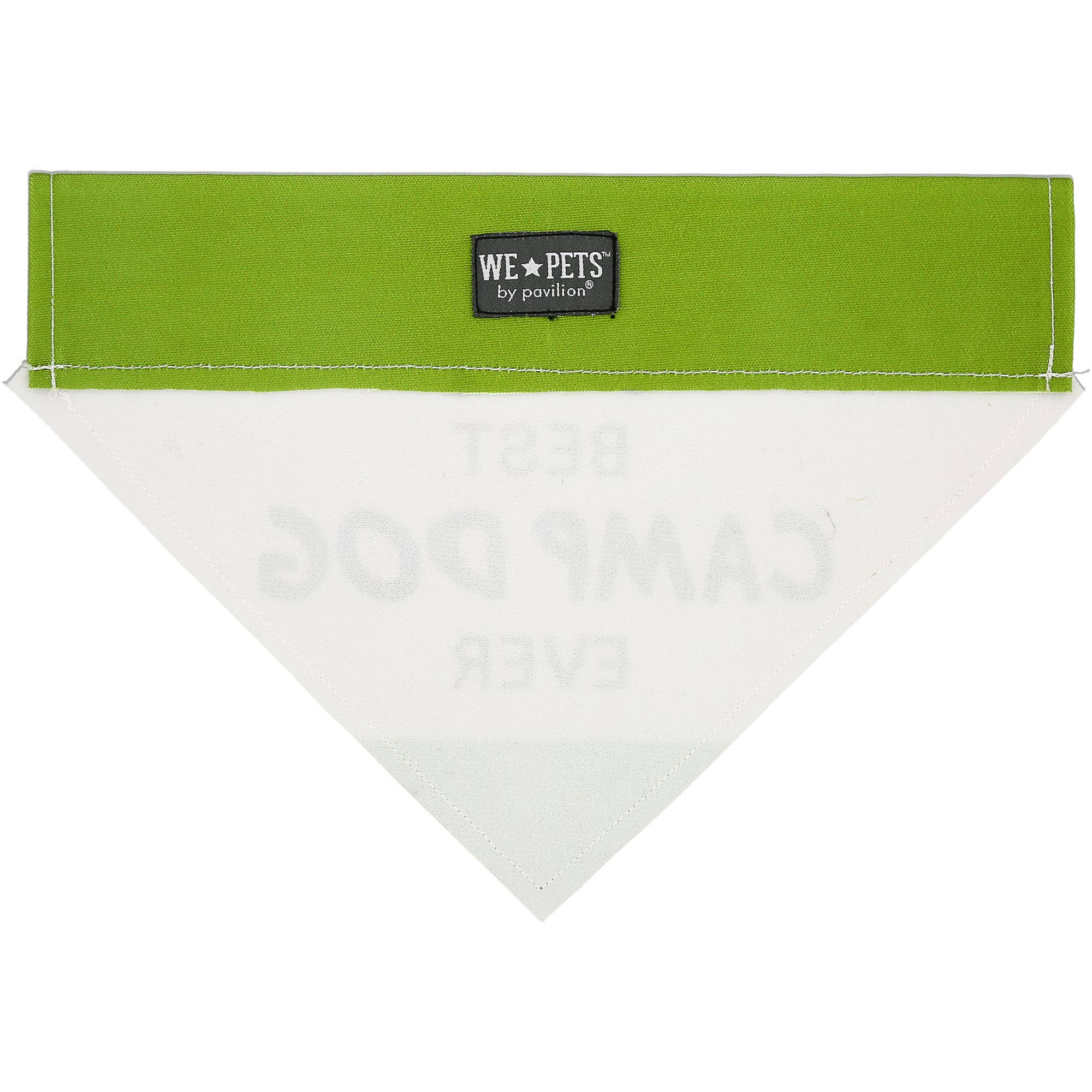 12" x 8" dog bandana, packaged in a plastic polybag, is made from a high-quality cotton and polyester blend and features a 2-inch hole which allows for a collar to be placed through. "Best Camp Dog Ever" text and accompanying tent, camper, and s'more icons are printed onto the front of the bandana. . Wash by hand only with a damp cloth. Set out in the sun to dry. . Great for those who wish to show their love of their camping dog. .