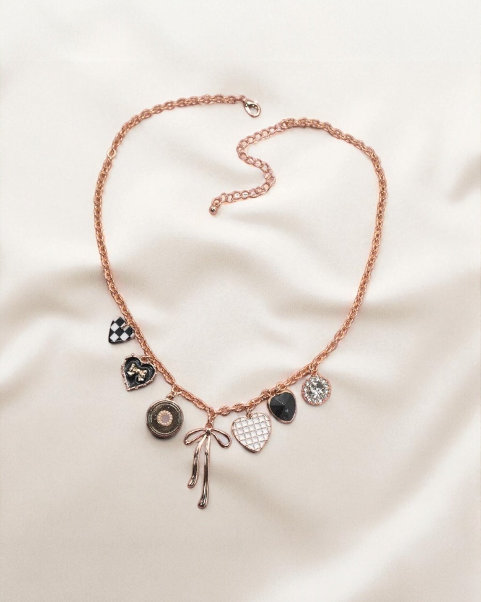 Add a dash of fun to any outfit with this playful charm necklace! Featuring a lively mix of bow, checker heart, rhinestone, and heart charms, this 17" chain is the perfect length to brighten your look. Each charm adds a unique sparkle and personality, making it an adorable accessory that’s sure to catch the eye and start conversations.