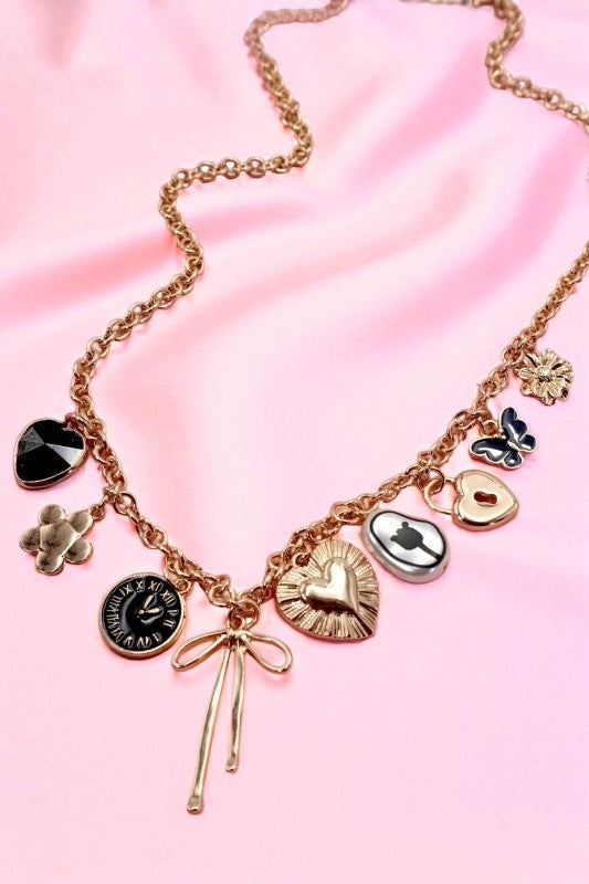 Add a touch of whimsy to your look with this playful charm necklace featuring a heart, clock, bow, and lock on a delicate 16" chain. Each charm tells a story, making it a fun and unique accessory for any outfit. Perfect for layering or wearing solo to brighten your day!