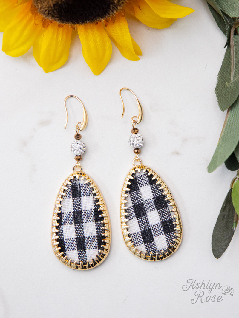 Buffalo plaid check earrings with gold frame and bead on French wires.