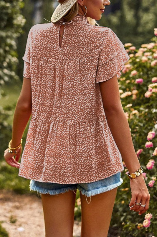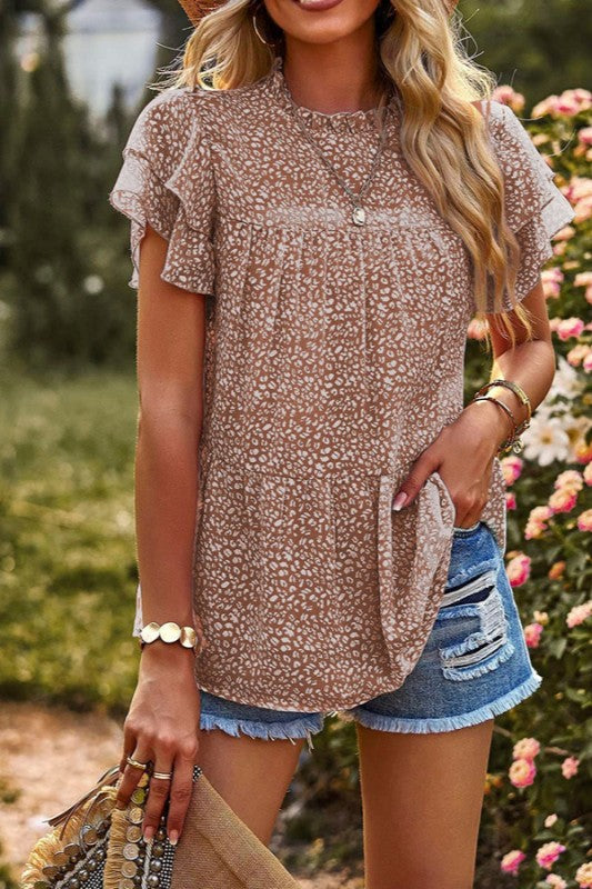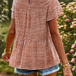 This coffee-colored chiffon blouse features playful polka dots and a lightweight, breathable fabric perfect for layering or wearing on its own. Its short sleeves keep you cool and stylish, making it an easy choice to brighten up any outfit.