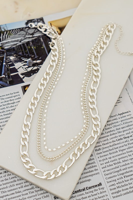 This necklace features three layers of bold curb chains, measuring 17", 18", and 20" in length, complemented by a 3" extender for adjustable wear.
