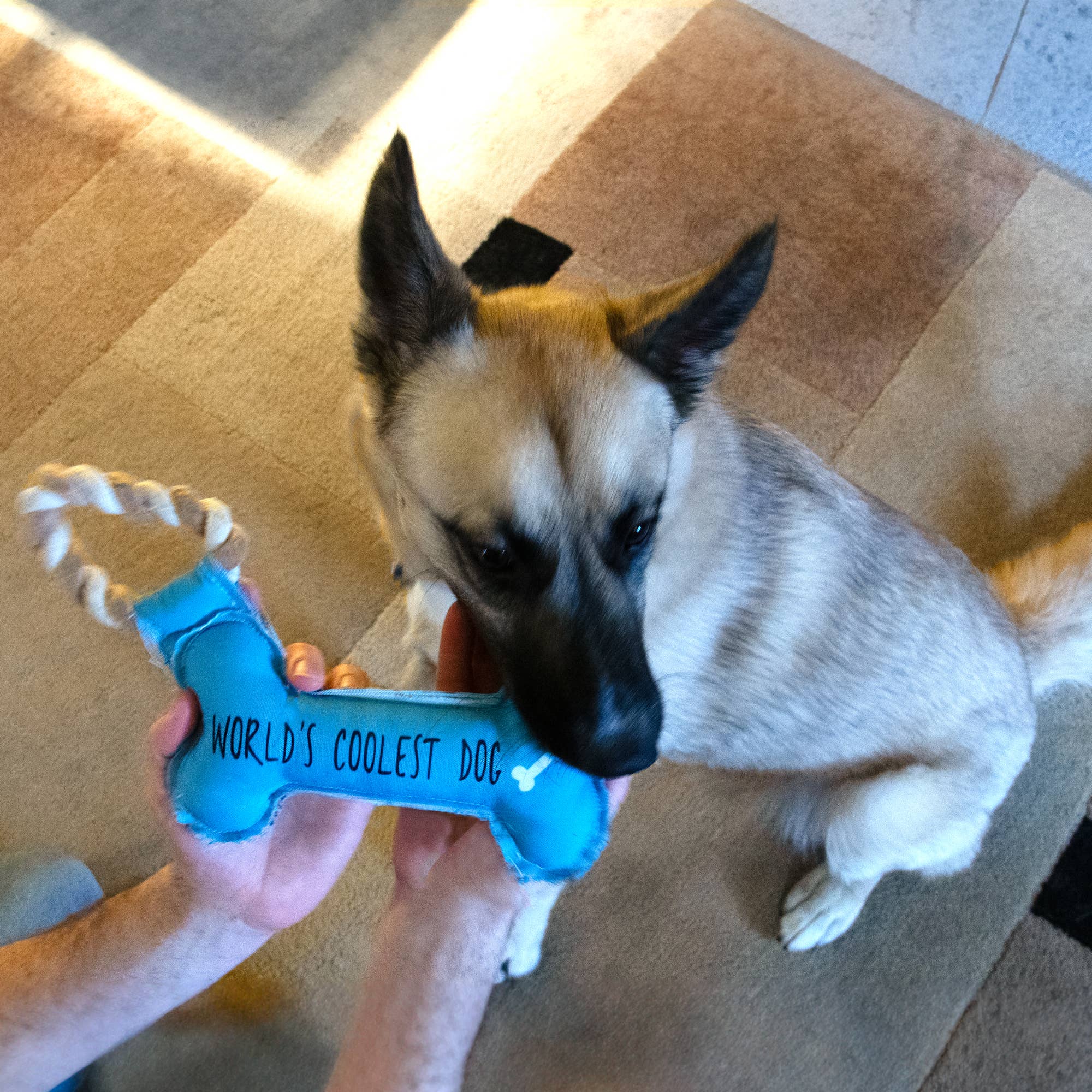 This durable dog toy features a fun "world's coolest dog" design on a blue canvas with a playful rope for tugging. Filled with soft polyester and a squeaker inside, it’s perfect for interactive playtime. Made to last and easy to clean, just hand wash with mild soap. Always supervise your pup during play and toss it out if damaged.