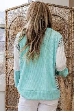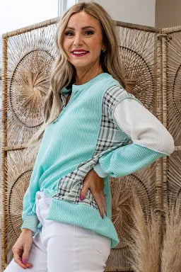 Stand out with this fun and fabulous corded textured top that celebrates bold pattern mixing. The Aruba blue base pairs beautifully with playful plaid patchwork panels, while the split open neck and long sleeves add a flirty, modern edge. Whether you're dressing up or keeping it casual, this piece brings personality and texture to your rotation. A wardrobe essential for anyone who loves to have fun with fashion.