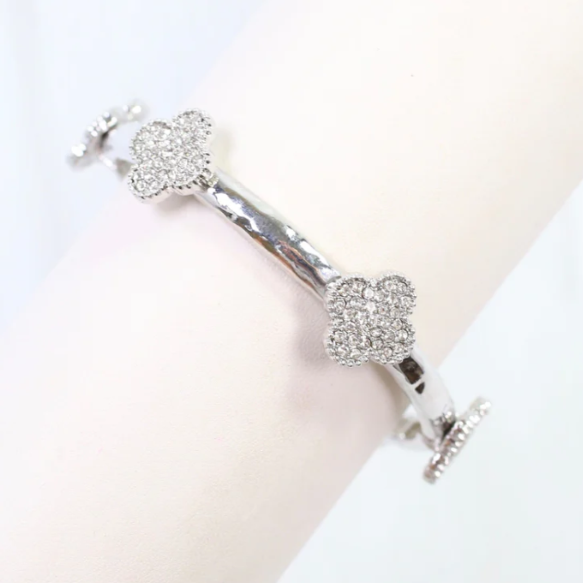 This gorgeous bracelet has a shiny hammered finish and features CZ filled clover accents. This piece has a wonderful sparkly look. Pair with your favorite bracelets to fit your own style. Stretches to fit most wrists.