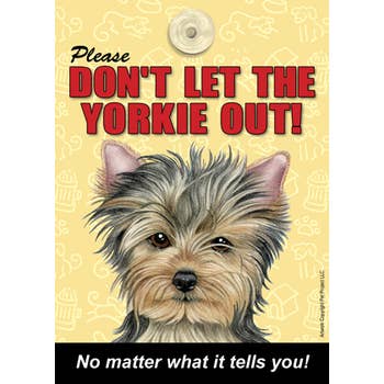 This charming 5" x 7" laminated sign is perfect for Yorkie lovers who want to keep their beloved pups safe and secure. Featuring a playful design and a handy suction cup, it easily attaches to windows or doors to remind everyone not to let the Yorkie out. Durable and weather-resistant, this sign adds a fun touch while keeping your furry friend protected from unexpected adventures. Ideal for any home with a mischievous Yorkie, it combines practicality with a dash of personality.