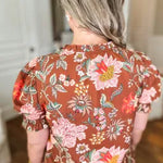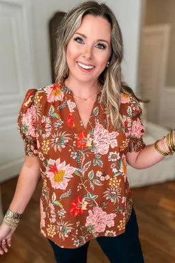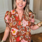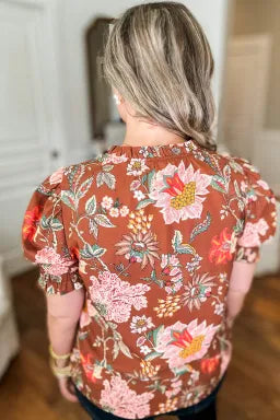 Embrace autumn vibes with this playful brown floral blouse featuring charming frill-trimmed puff sleeves. Designed in plus size for a comfortable, flattering fit, it’s perfect for adding a touch of whimsy to your fall wardrobe.