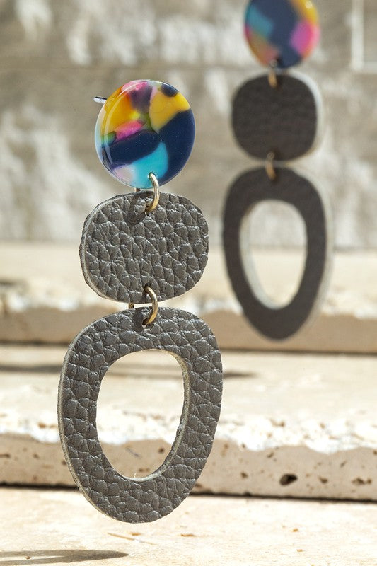 These playful earrings feature textured faux leather ovals paired with a fun acetate circle and secure post.