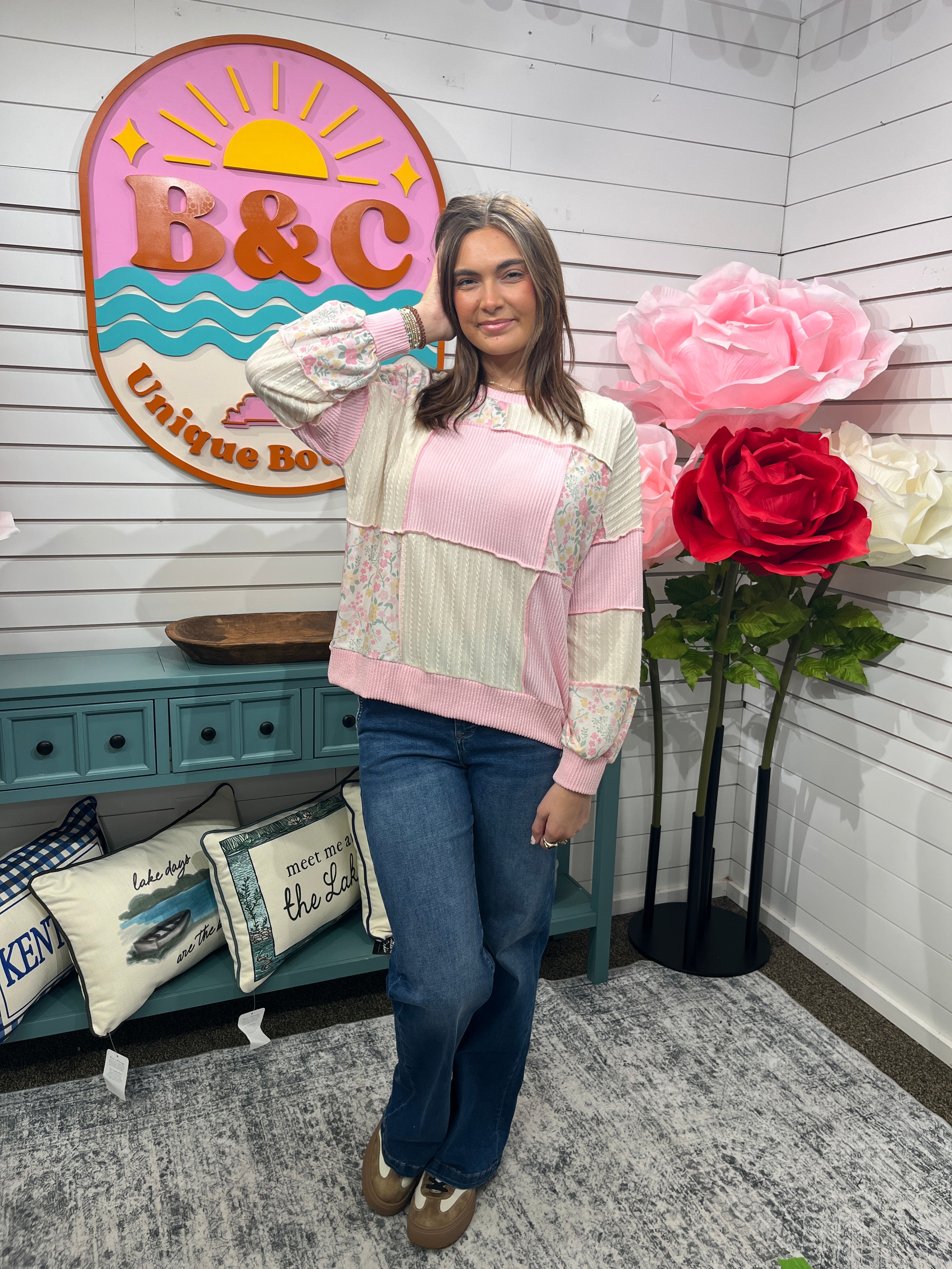 Charming floral print layered with color-block patchwork, it blends playful style with comfort. The soft French terry fabric hugs you in all the right ways, while the ribbed cable knit details and bubble long sleeves add texture and personality. Round neckline keeps things effortlessly casual. Perfect for weekend lounging or dressing up with your favorite jeans—this top brings joy to your everyday rotation.