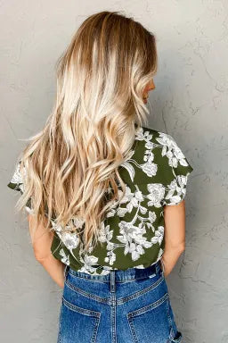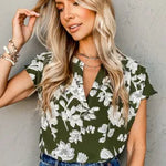 Bring a fresh, playful vibe to your look with this green floral print blouse. Its split neck adds a flirty touch, while the short sleeves keep it light and breezy—perfect for sunny days and spontaneous adventures.