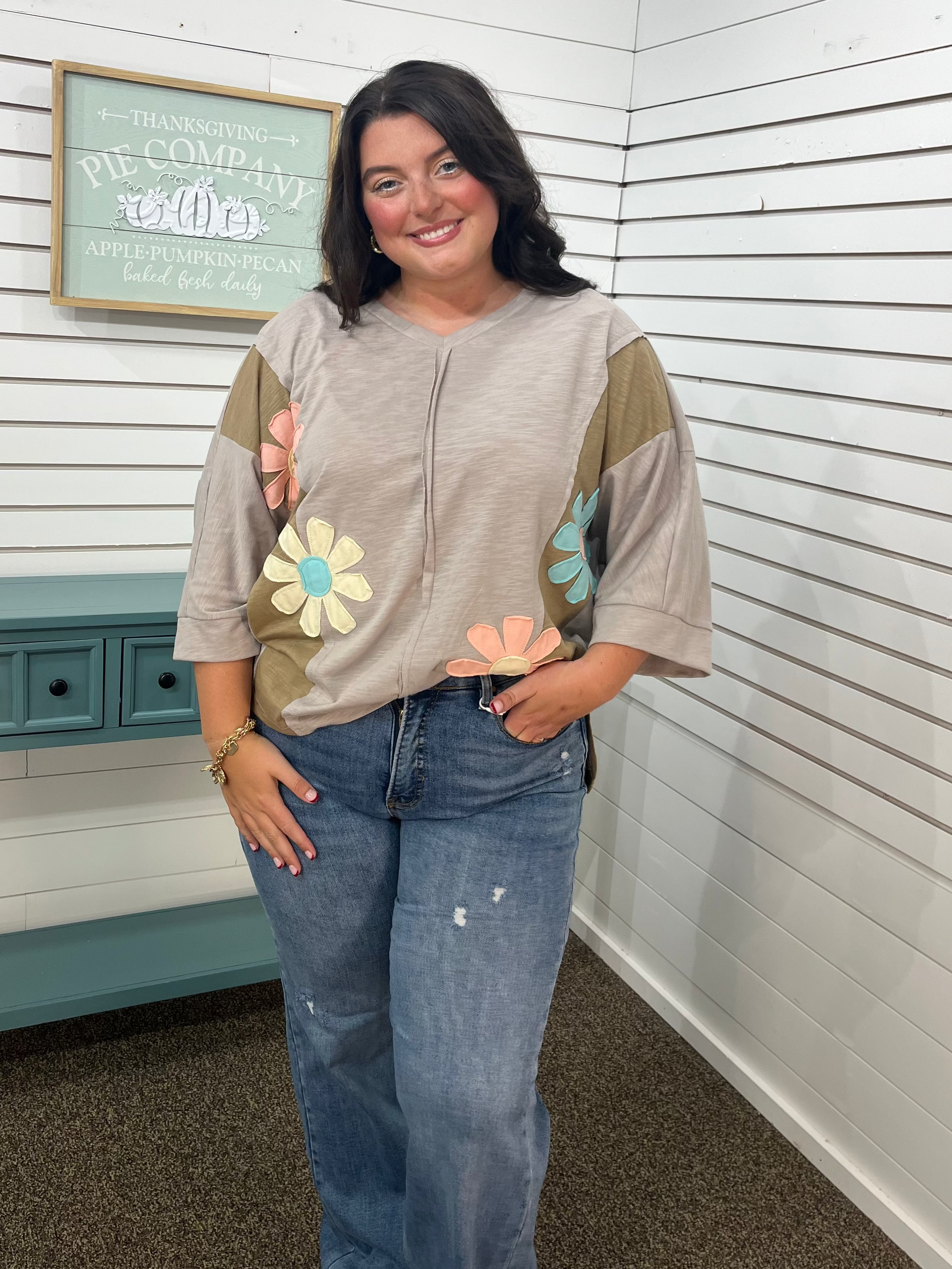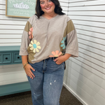 Brighten your day with the Flower Patch Exposed Seam Top! This playful V-neck features eye-catching big flower patches that add a burst of charm, while the 3/4 sleeves keep it breezy and fun. Perfect for mixing bold floral vibes with casual comfort.