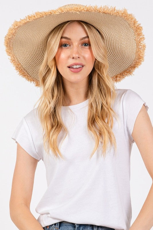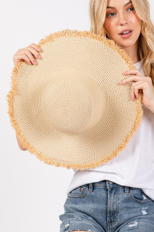 Prepare for sunny days and good times with our frayed edge floppy straw hat! This chic accessory combines flair and practicality, making it ideal for all your outdoor escapades. Featuring frayed edges and a soft beige hue, it brings a breezy, laid-back vibe to any look. Stay cool and shaded while keeping your style on point!