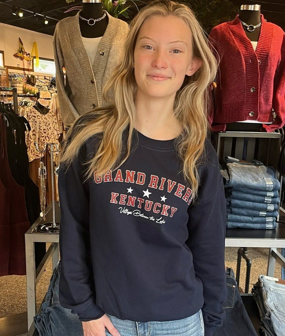 Set sail with style in the Grand Rivers Navy sweatshirt! This playful and cozy top brings local Kentucky charm right to your wardrobe. Perfect for showing off your community spirit while staying comfy and cute—join the crew and wear your pride with a smile.