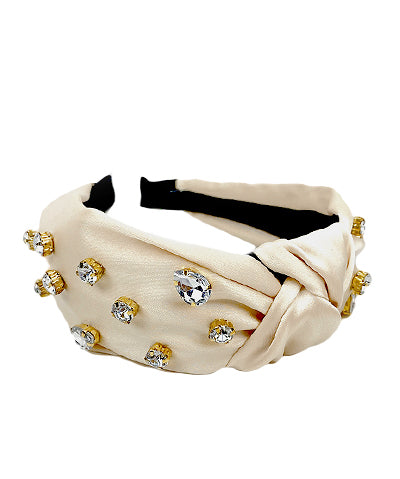 This charming wide headband features a playful knotted design adorned with sparkling crystal studs.