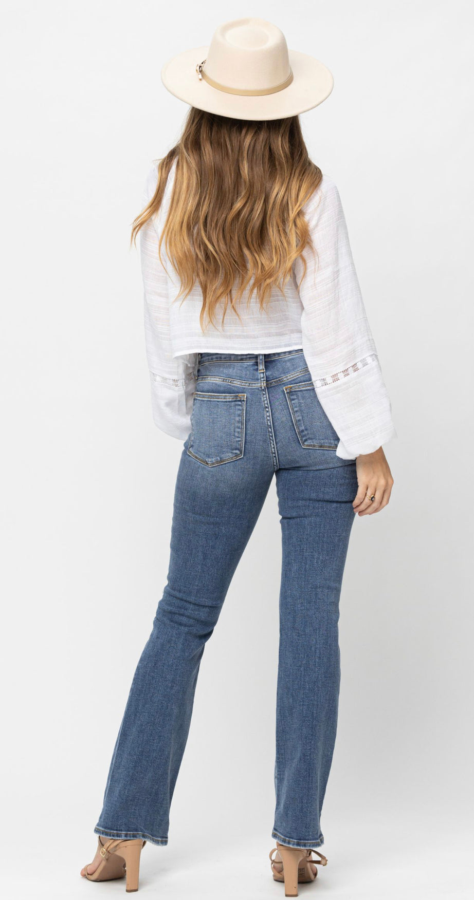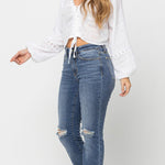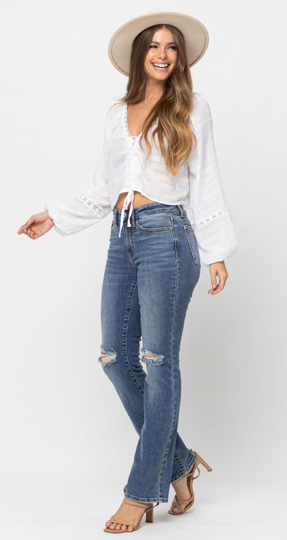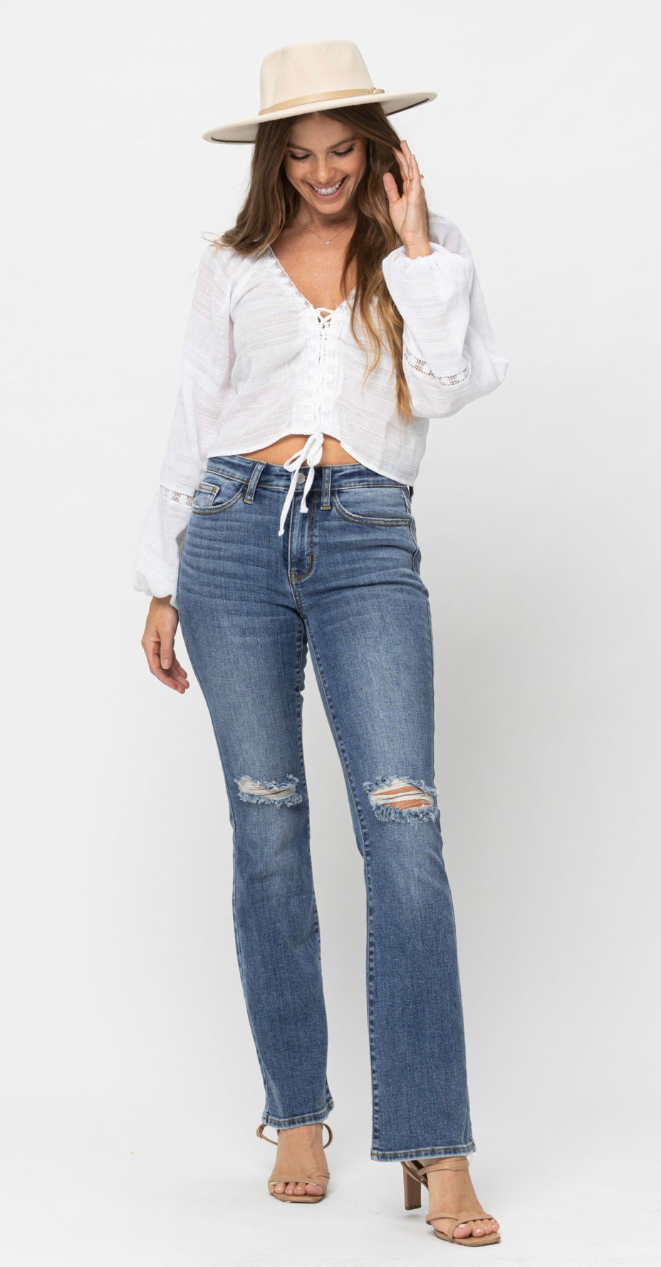 Your favorite brand in your favorite style! Destroyed knee boot cut in a mid rise.