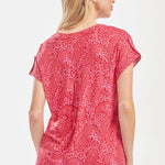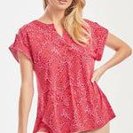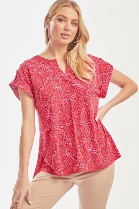 Start your day effortlessly with the Lizzy Red Pink Top. Featuring easy cuffed short sleeves, it stays sleek without wrinkles, while the notched v-neck adds a fun twist. The lively red and pink hues will keep your mood bright and spirited all day. (No ironing required!)
