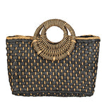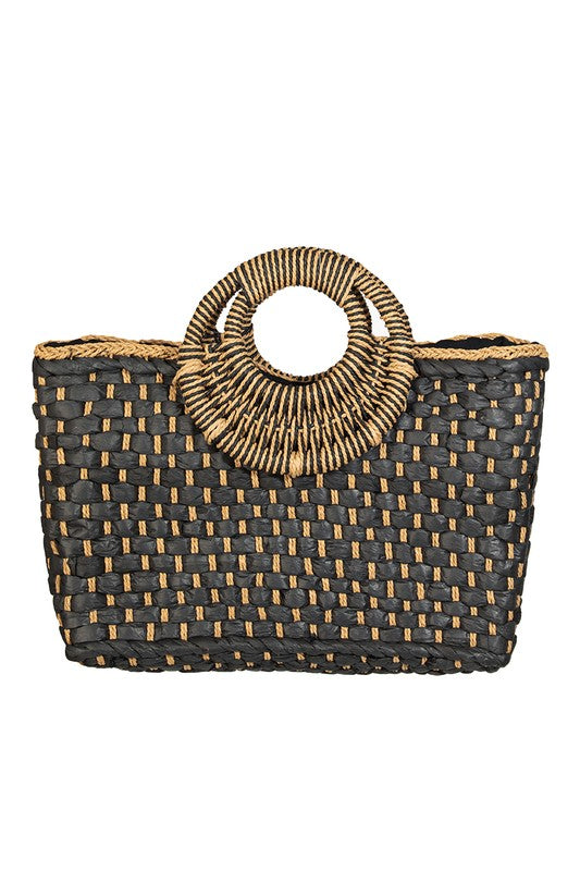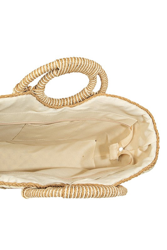 Charming straw tote featuring a fun braided design and a standout braided handle. Measures 14" wide by 10" high.