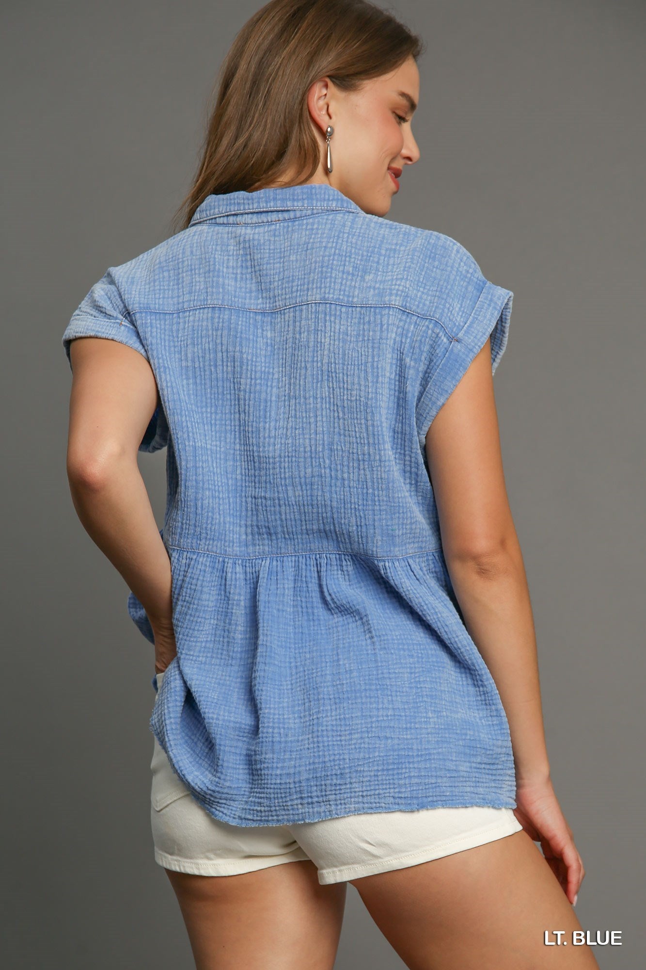 Embrace effortless style with our light blue mid button baby doll collared top! crafted from soft, washed gauze fabric that feels like a cloud against your skin. the playful silhouette features two practical chest pockets and a charming collar with mid-placed buttons for that perfect balance between put-together and carefree. breeze through your day in airy comfort!