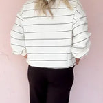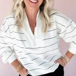 Set sail in style with this playful white top featuring classic navy stripes. The zipper v-neck adds a fun twist, while the long sleeves keep it cozy and casual. Perfect for breezy days when you want to channel nautical vibes with a fresh, relaxed look.