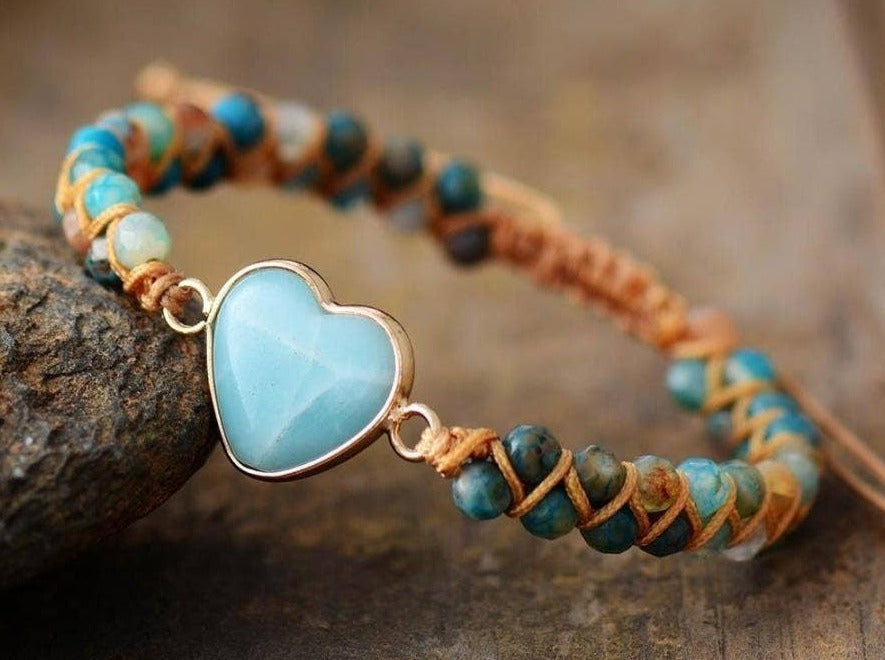 This handmade Natural Amazonite Heart Bead Bracelet features stainless steel accents and fits adjustable sizes from 6.5 to 8.5 inches. Crafted with care, it offers a timeless, elegant accessory for any occasion.