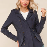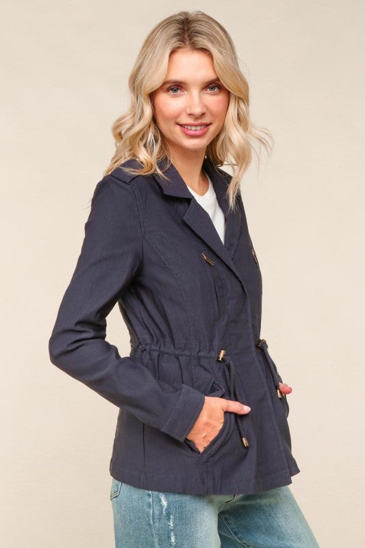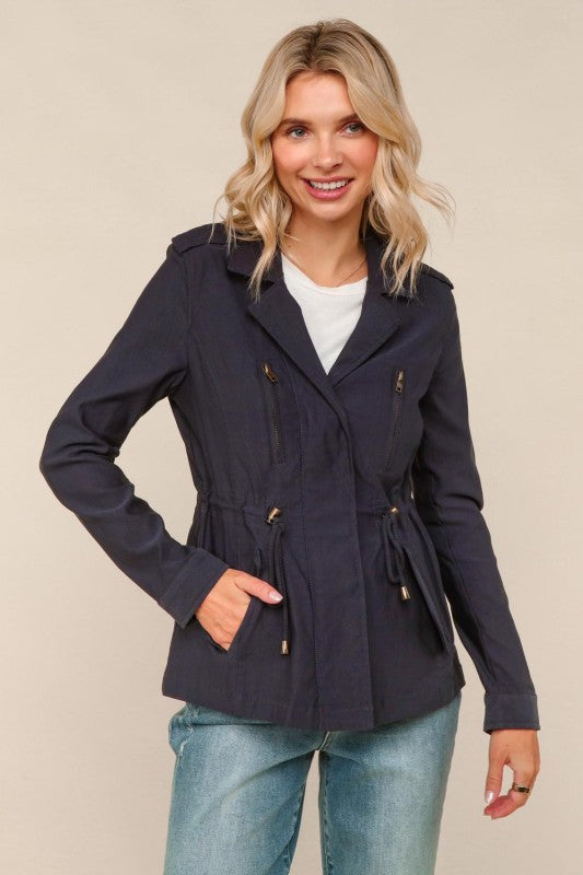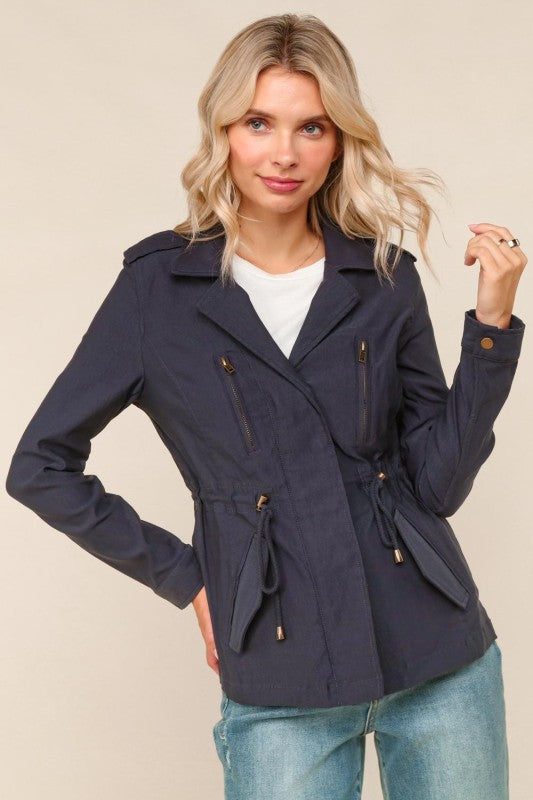 This navy jacket brings playful style to your wardrobe with its charming notched collar and comfy long sleeves. Featuring both zipper and snap button closures, it’s easy to zip up or snap shut—plus handy pockets keep your essentials close. The adjustable waist lets you tailor the fit for a look that’s uniquely yours. Perfect for mixing fun with function!