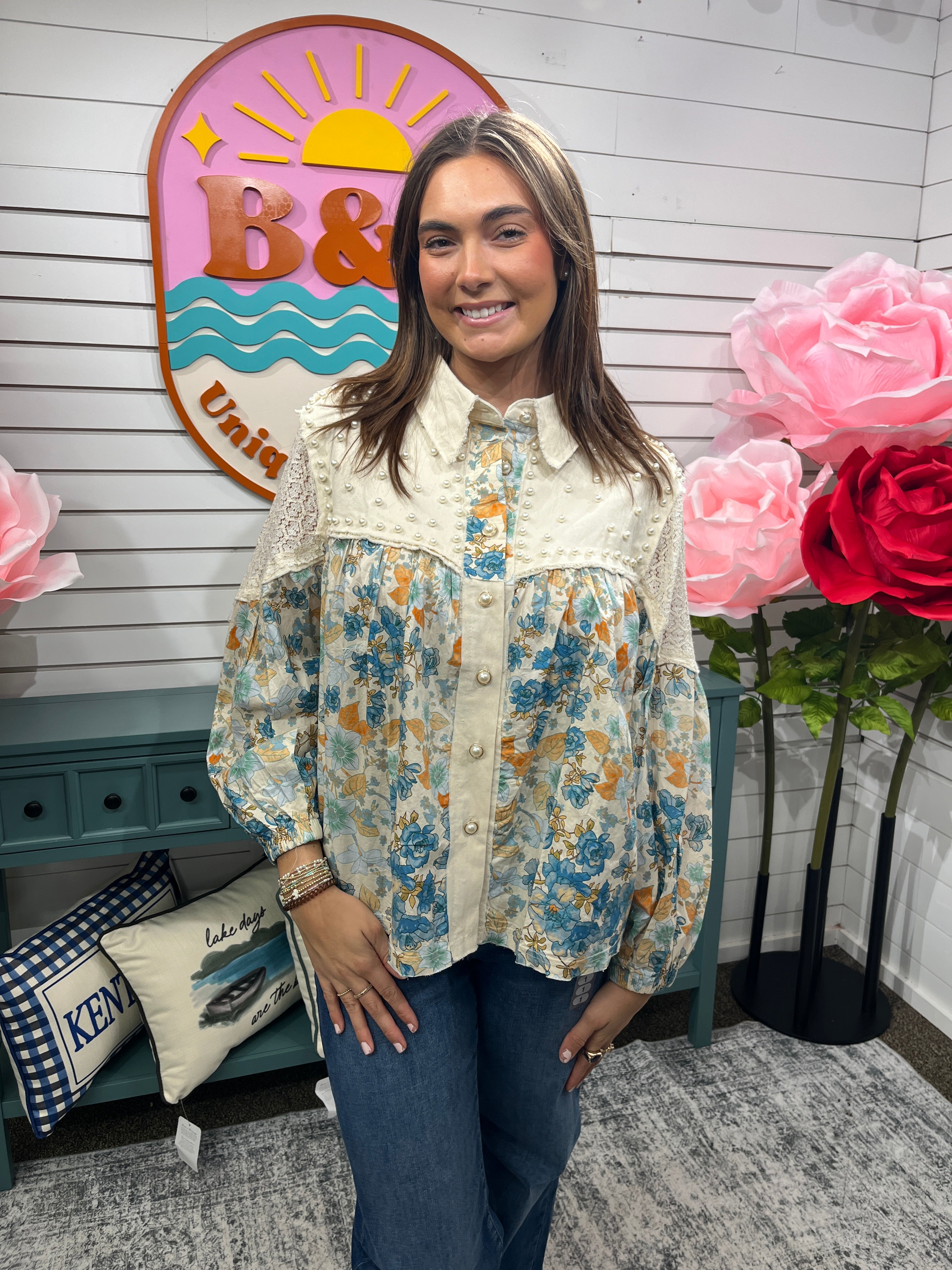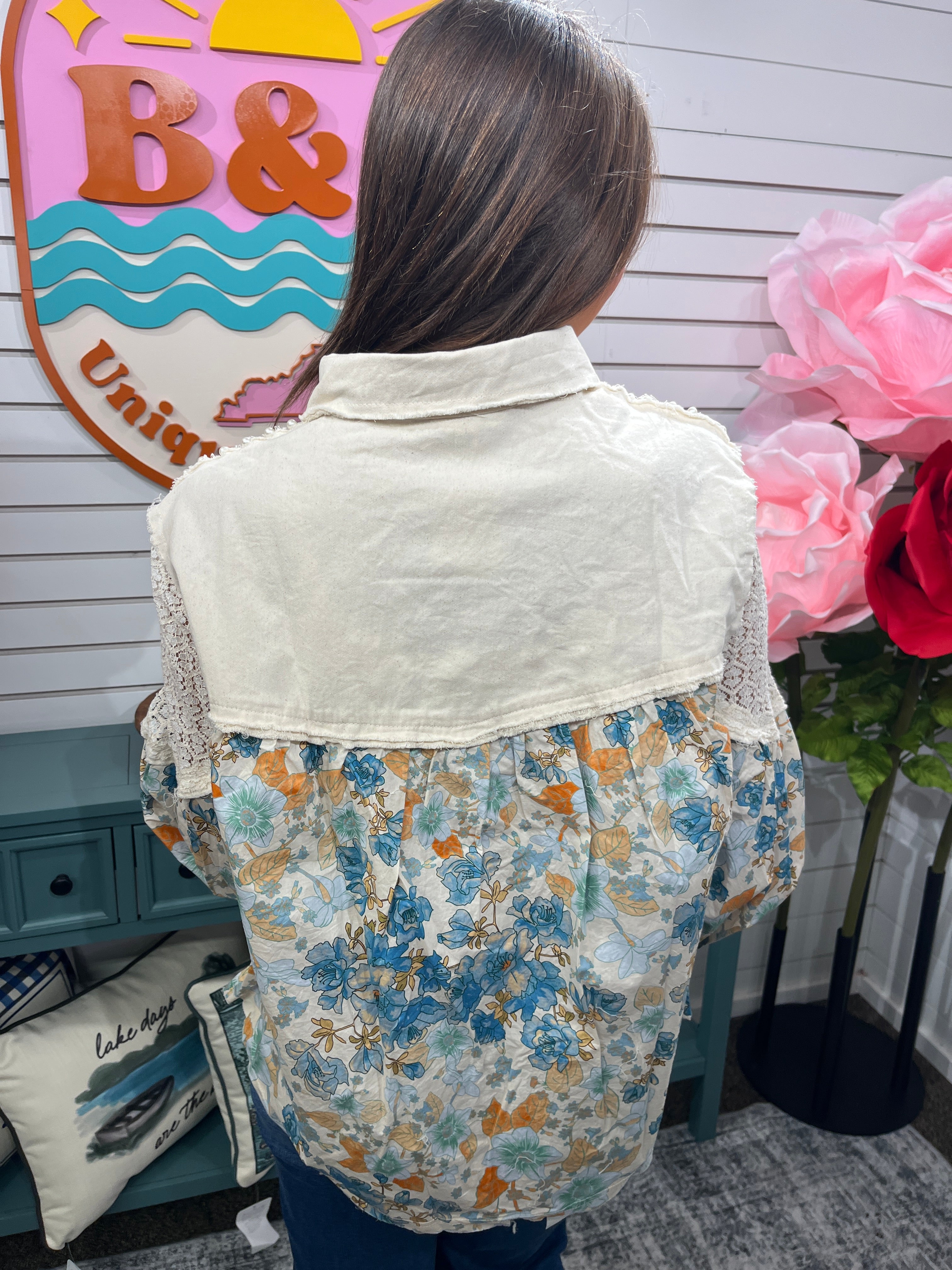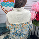 Layer this effortlessly cool button-down and let the details do the talking. Featuring an open weave design at the shoulders paired with long sleeves, it's got that relaxed, oversized fit that works with everything. The real magic? Floral patchwork across the body and sleeves that brings personality and movement to your everyday look. Throw it on solo or over a tee—either way, you've got style covered.