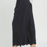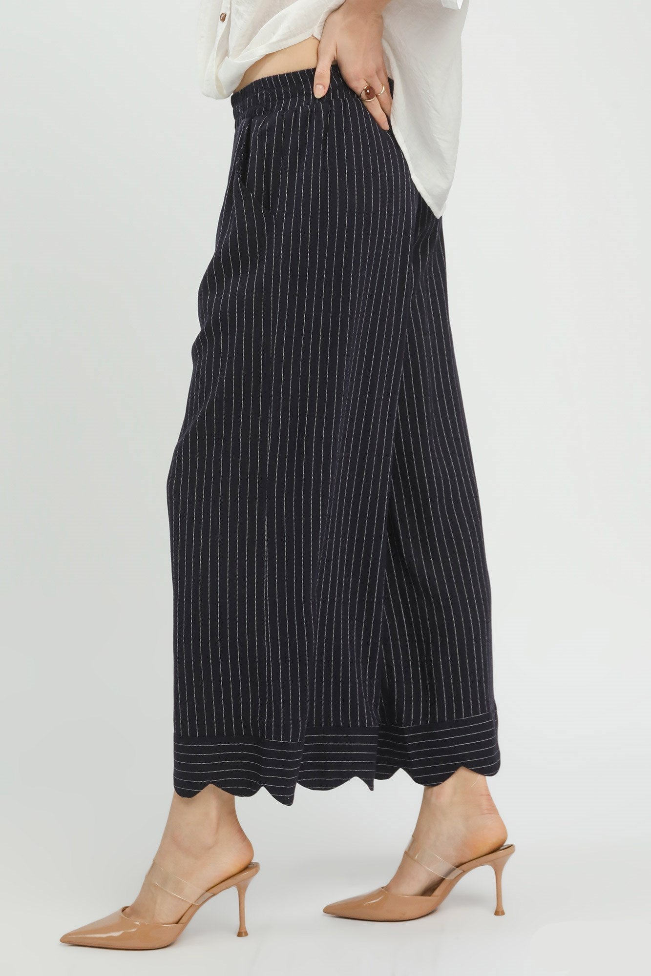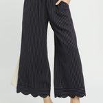 Navy with pinstripes meet playfulness in these charming linen wide-legs. The classic pinstripe pattern keeps things sophisticated, while the scalloped hem brings a delightful twist that makes them anything but ordinary. An elastic waistband means zero compromise on comfort—slip them on and forget about them. Perfect for warm-weather dressing when you want effortless style with a hint of personality.