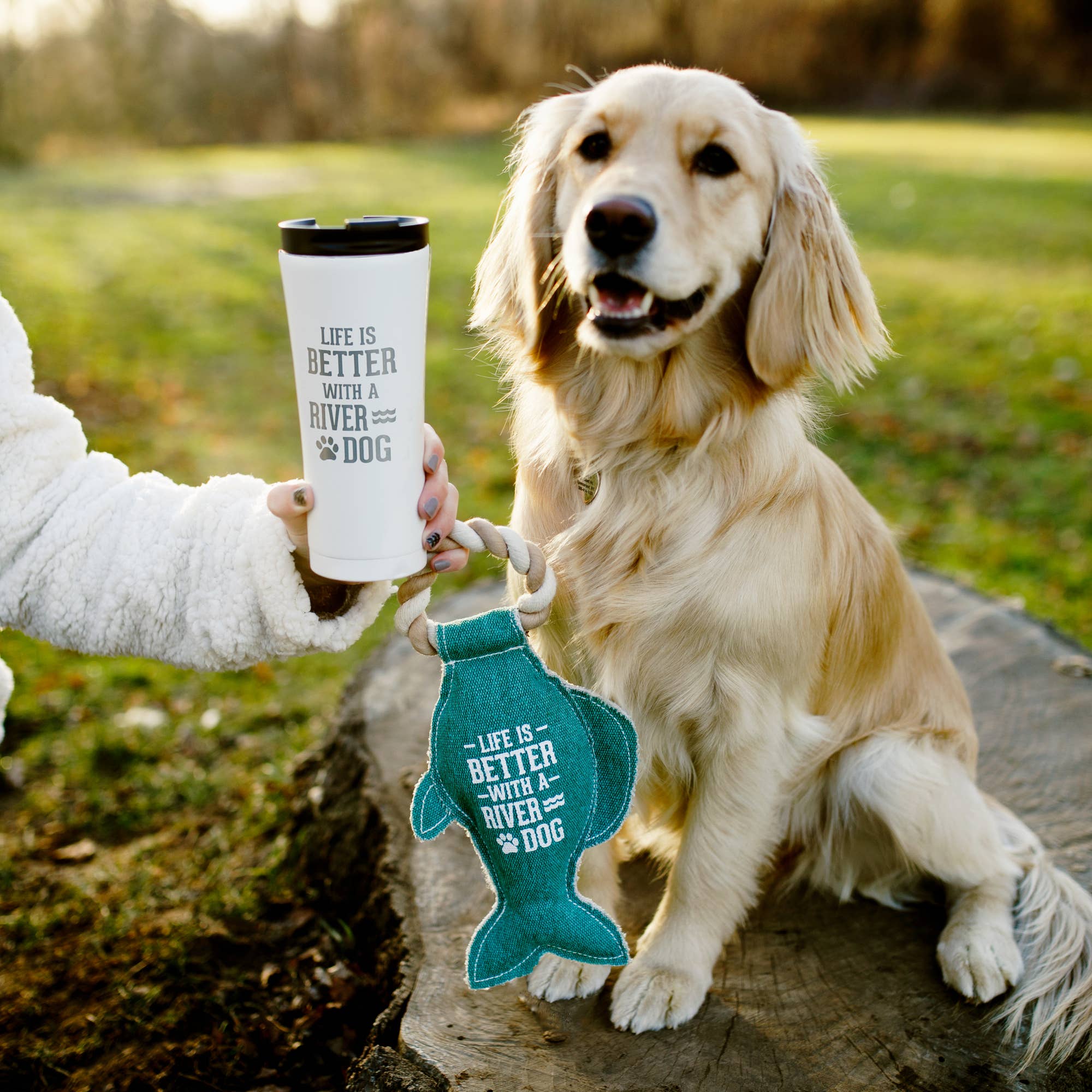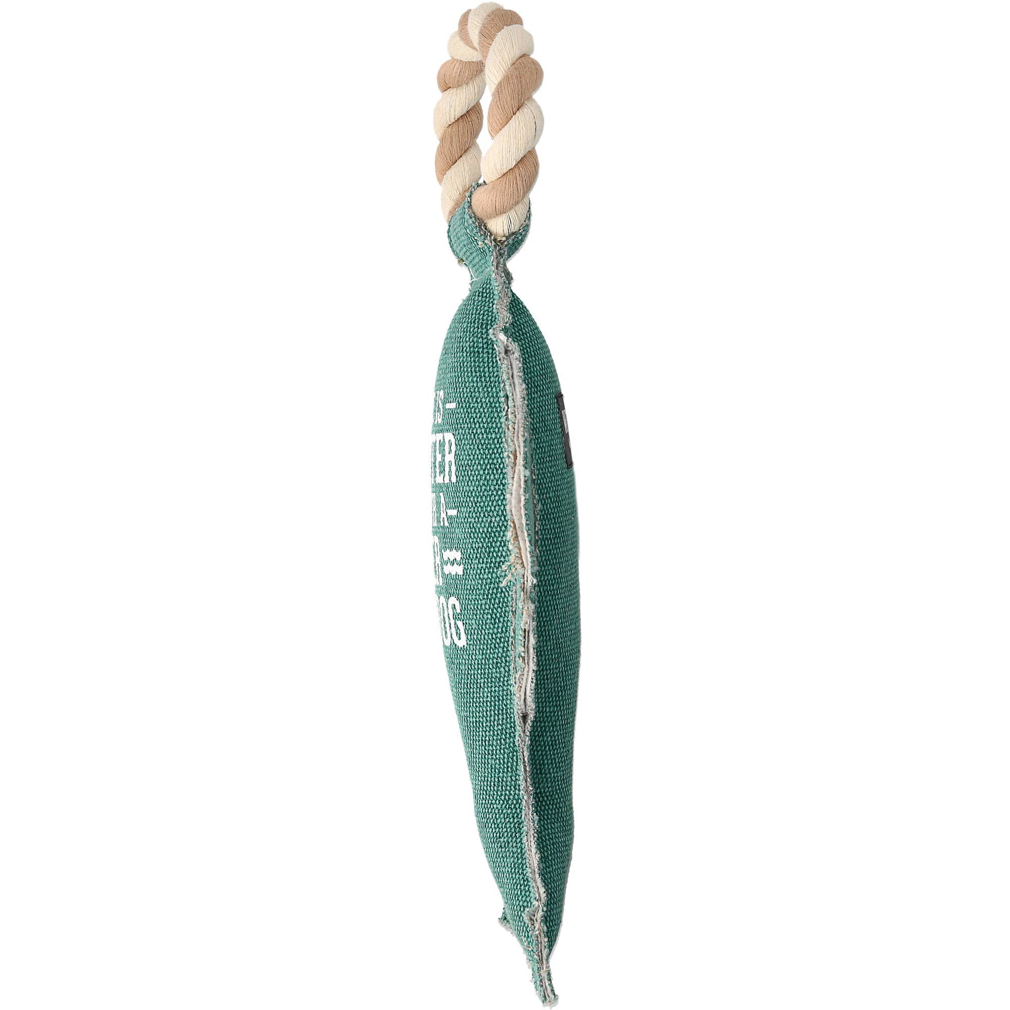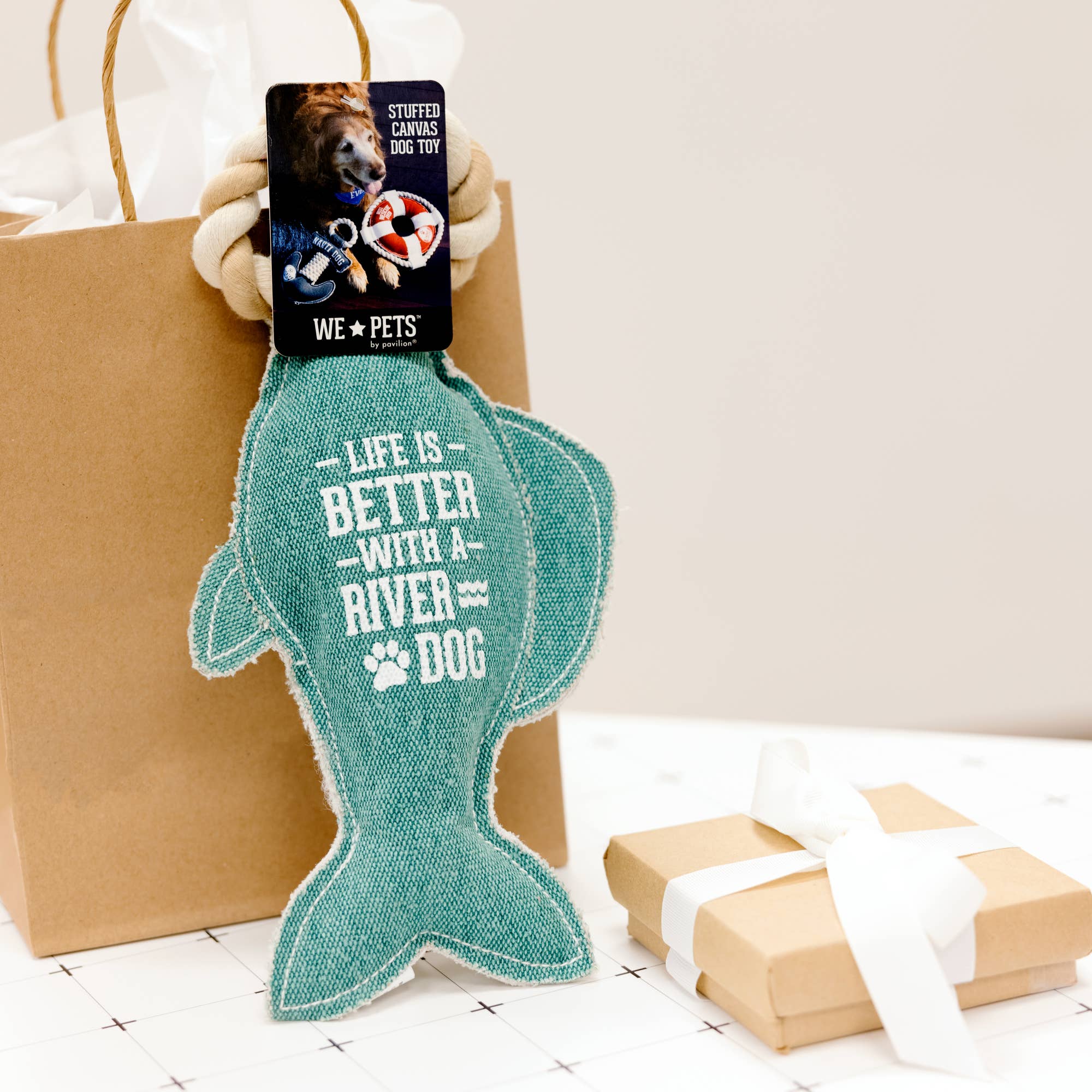 This 12" canvas dog toy shaped like a fish is perfect for playful pups. Made from durable polyester and cotton, it features a squeaker for extra fun and a sturdy rope for tugging. Its rustic look and colorful design brighten up playtime. Easy to clean and designed for supervised play, it’s a lively companion for you and your dog’s adventures.