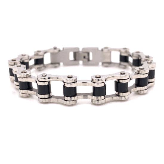Discover a sophisticated bracelet that reflects your passion for cycling. The Stainless Steel and Black Bike Chain Bracelet features a distinctive bike chain design with elegant black accents and a secure snap lock clasp. Crafted from 316L surgical grade stainless steel, it offers lasting durability without fading, tarnishing, or discoloring your skin—even when exposed to water. Hypoallergenic and resistant to breakage, this bracelet is a refined choice for those seeking both style and resilience. Available in multiple sizes, it makes a timeless accessory for men and women alike.