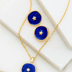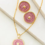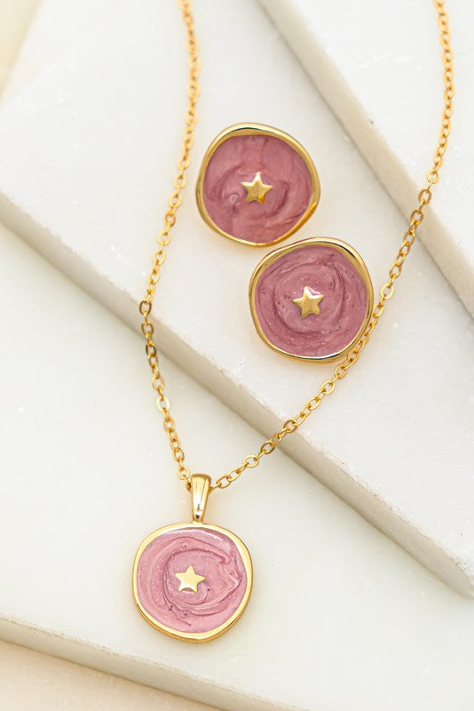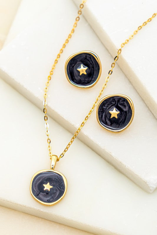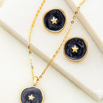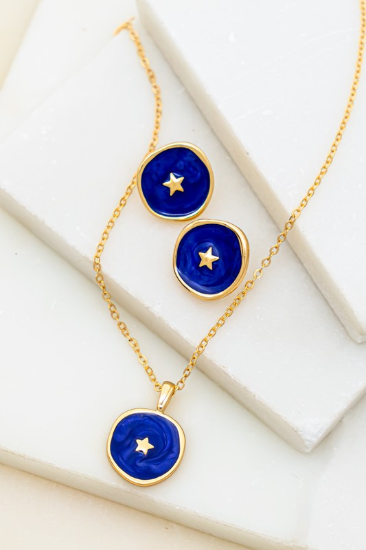 Add a touch of celestial charm to your look with the Star Coin Necklace. Featuring an embossed star coin set against a rich enamel background, this necklace shines with playful elegance. The set includes matching earrings to complete your starry ensemble. Designed for versatility, the adjustable chain measures 16 inches, extending up to 19 inches to fit comfortably with any outfit. Perfect for day-to-night wear, this necklace brings a whimsical sparkle that’s sure to brighten any moment. Embrace your inner star and let your style twinkle with every turn.
