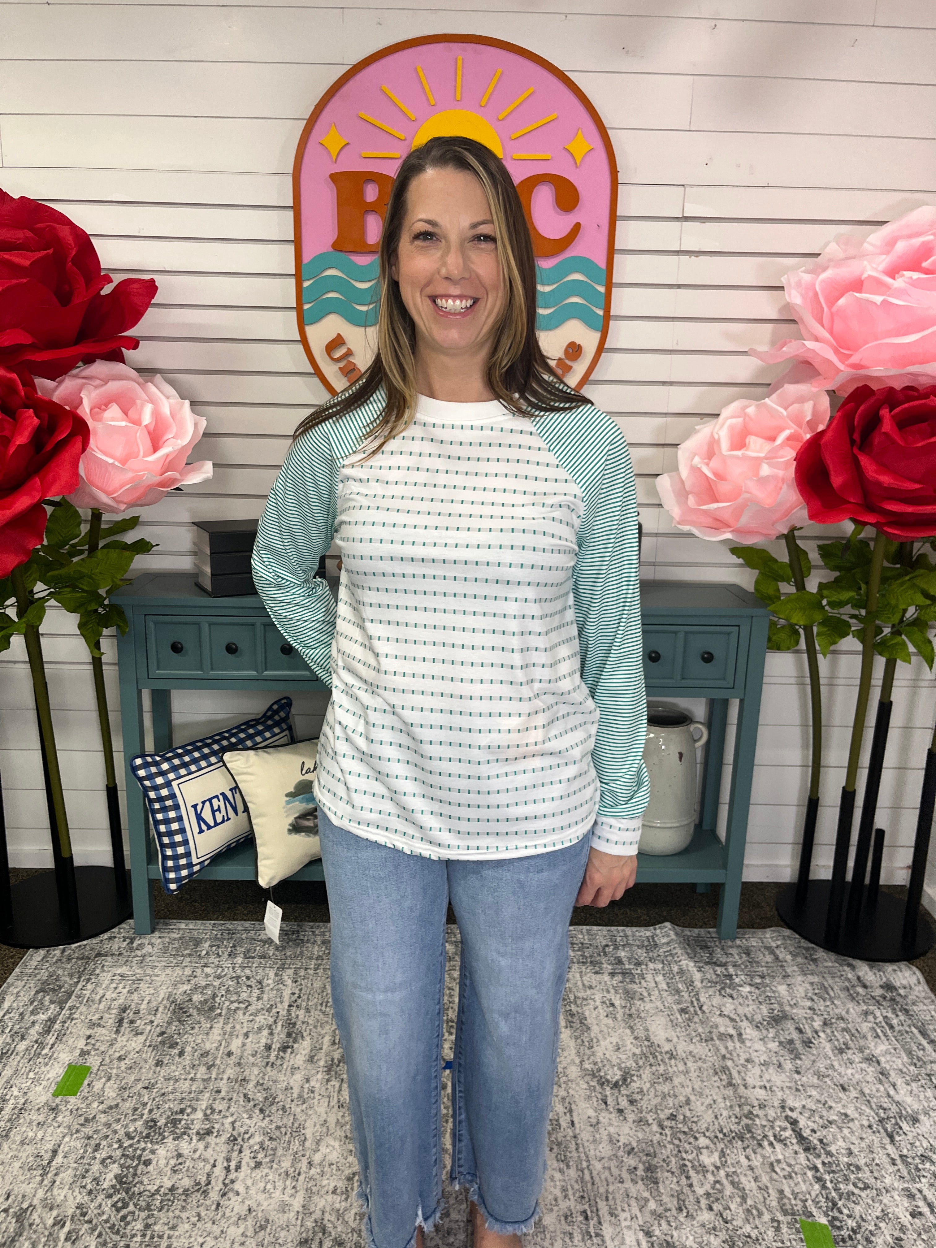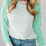 Get ready to turn heads with this fun and flirty raglan top that's bursting with personality. The crisp white body provides the perfect canvas for eye-catching long striped sleeves in light green, while dashed stripes dance across the body and cuffs for an extra pop of visual flair. This playful patchwork design brings movement and dimension to your everyday look, making it ideal for mixing and matching with your favorite bottoms. Comfortable, quirky, and endlessly wearable—it's the kind of top that makes getting dressed feel like playtime.