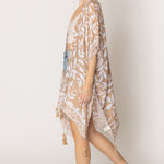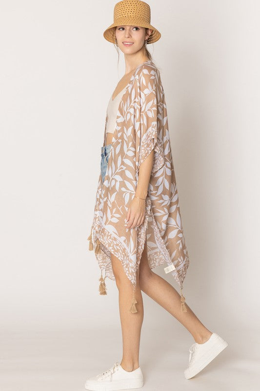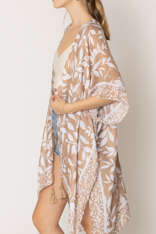 Boost your summer vibe with our charming summer kimono! Adorned with a graceful leaf pattern and fun tassels, this adaptable piece works perfectly as a beach cover-up or a trendy addition to any look. Keep cool and stylish throughout the sunny days! Fits most sizes comfortably.