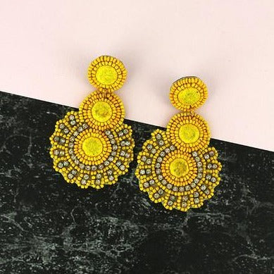 Bright and lively, these earrings add a pop of fun to any look! Ideal for sunny days, they feature seed beads, sparkling crystal details, colorful fabric circles, soft felt backing, and goldtone posts. Measuring 2.5 inches, they are safe with lead and nickel compliance.