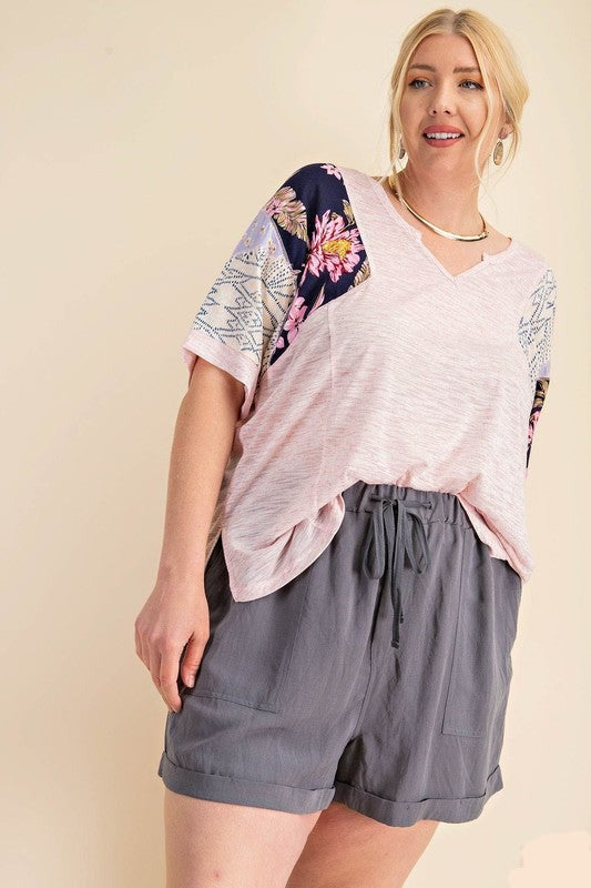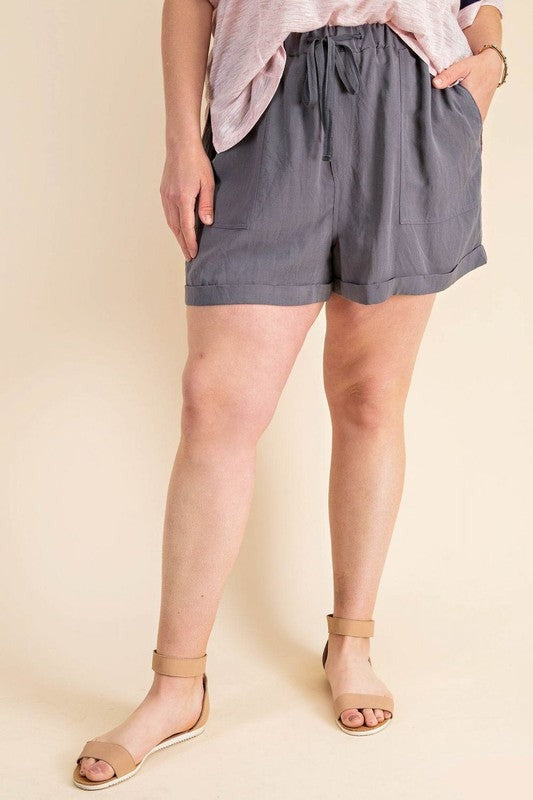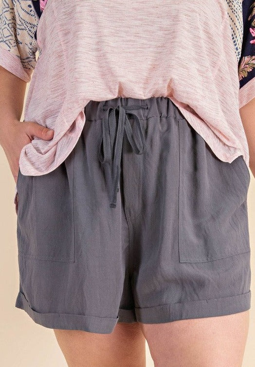 The best loose fitting drawstring shorts! 80% linen and 20% rayon with side pockets and drawstring. Ash grey.
