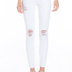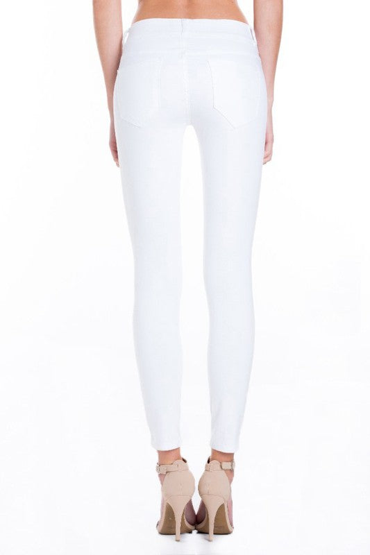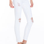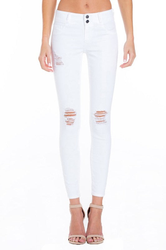Five pockets with distressed two button features, sits just below the waist. White jeans are just the style you need for summer!