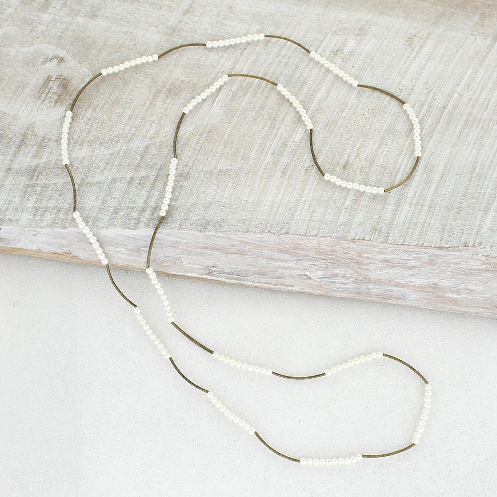 This elegant 44" stretch necklace showcases pearls accented with vintage-style pole beads. Designed for versatility, it can be stylishly worn as either a necklace or wrapped as a bracelet.
