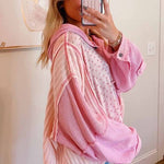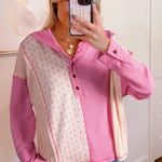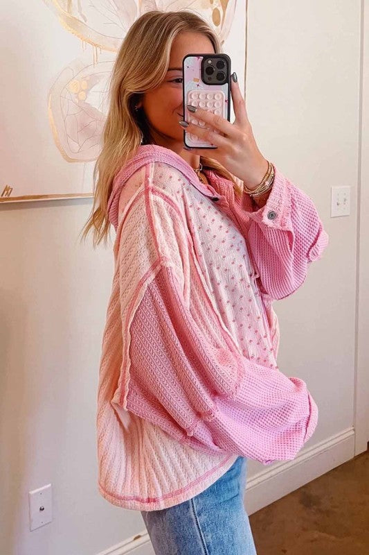 Embrace cozy comfort with this waffle floral patchwork hooded oversize pullover. Its body-friendly oversized fit lets you move freely, while the playful floral patchwork textures add a sweet, feminine touch. Perfect for layering or lounging, this pullover combines warmth and style in a fun, effortless way.