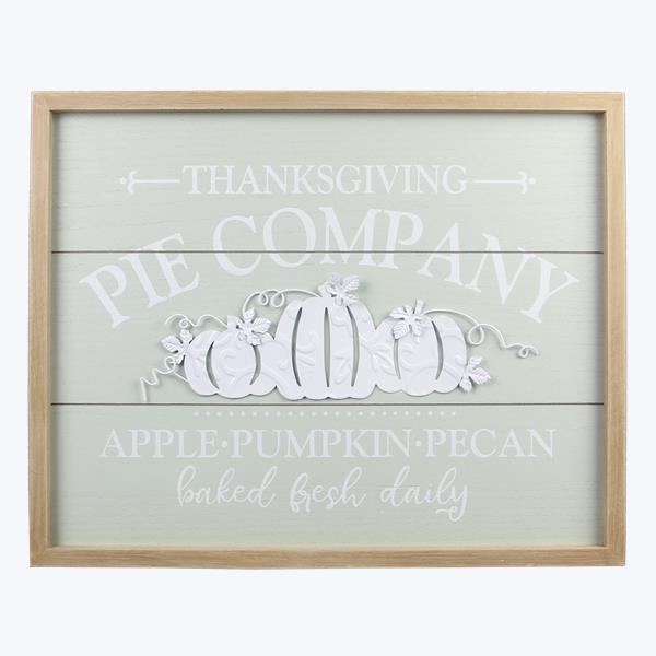 Add a cozy touch to your autumn decor with this charming Thanksgiving sign in a soft neutral shade. Featuring a wood frame, the rectangular fall wall sign showcases playful text: Thanksgiving Pie Company — apple, pumpkin, pecan, baked fresh daily. Measuring 19.75" x 1" x 15.75", it’s the perfect festive treat for your walls!