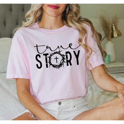 Spread the truth with True Story In Blossom! This Comfort Color tee features a message about Jesus, printed in soft fabric and comes in adult unisex sizes. Get the message out and share the good word. (No kidding, it's true!)"